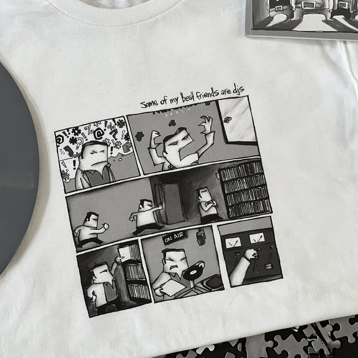 - Super comfortable 100% cotton T-shirt featuring the artwork from the “Radio DJ” page in the comic book!