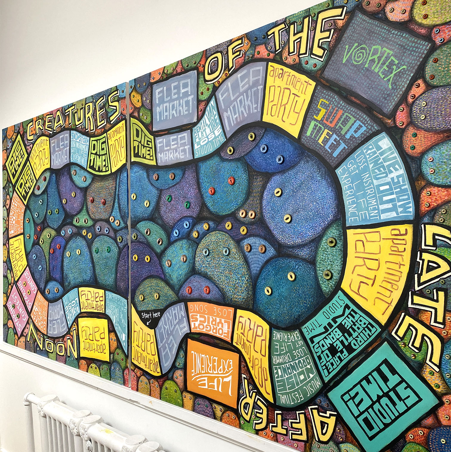 For owners of Board Game Cafés or someone looking for a statement piece and with a giant blank space on the wall! The original 4′ x 8′ Game Board painting from the Juno-nominated album Creatures of the Late Afternoon. I’ve witnessed firsthand the contents of this game board has caused many-a-smile, laugh and giggle at our Creatures Board Game Events around the world and also in people’s living rooms/game rooms as they’ve played the game since it’s release!